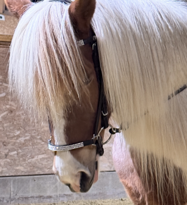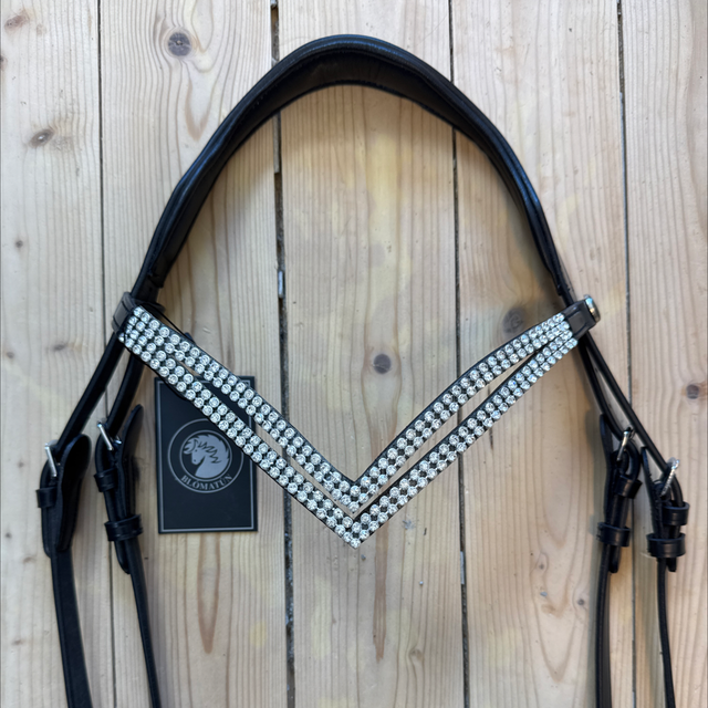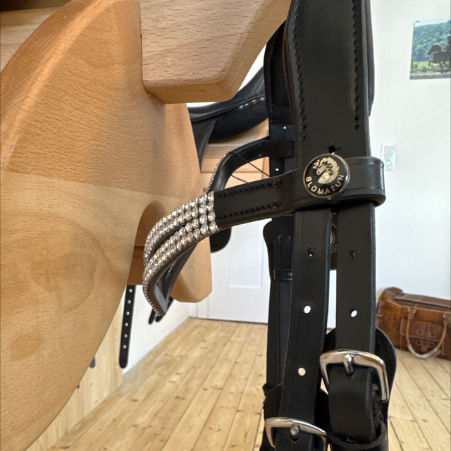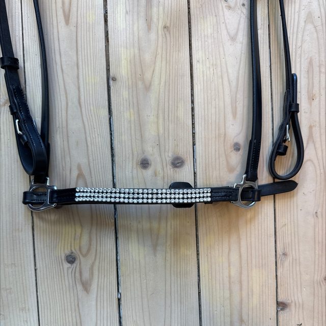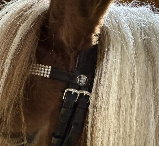 Die Trense Halastjarna ist ein hochwertiges, einteiliges Hannoveranisches Reithalfter mit anatomisch geformtem Kopfstück und auffälligen Kristallverzierungen. Sie vereint stilvolle Optik mit optimalem Komfort für Pferd und Reiter.