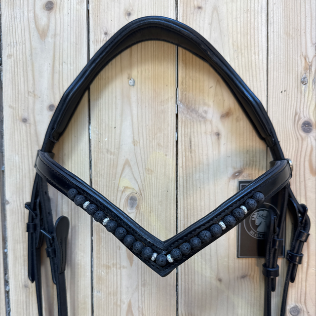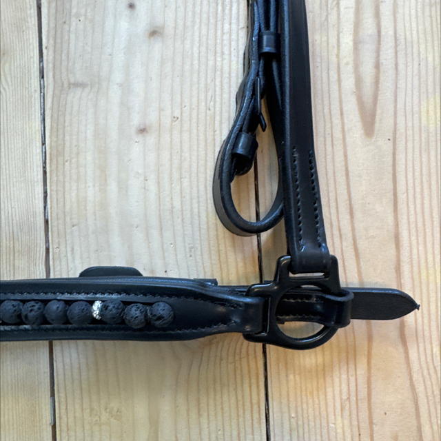 Die Trense Katla vereint Komfort und Stil: ein elegantes, einteiliges Hannoveranisches Reithalfter mit anatomisch geformtem Kopfstück. Verziert mit Lavaperlen und funkelnden Kristallringen.