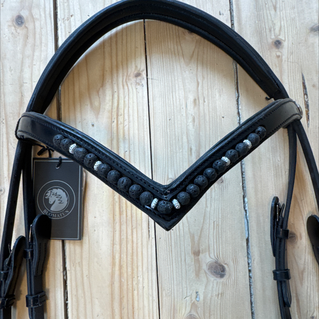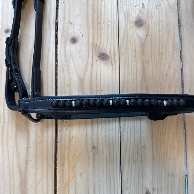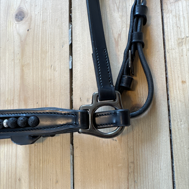 Die Trense Kolfinna ist ein elegantes einteiliges Hannoveranisches Reithalfter verziert mit Lavaperlen und Kristallringen. Die besondere Verarbeitung der Trense bietet mehr Freiheit für die Augenpartie aufgrund verlängertem Stirn- und Nasenriemen und höher angesetzter Schnallen. Dadurch bietet die Trense dem Pferd besonderen Komfort und eine individuelle Anpassung.