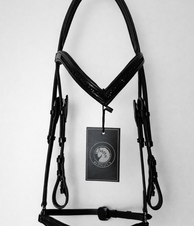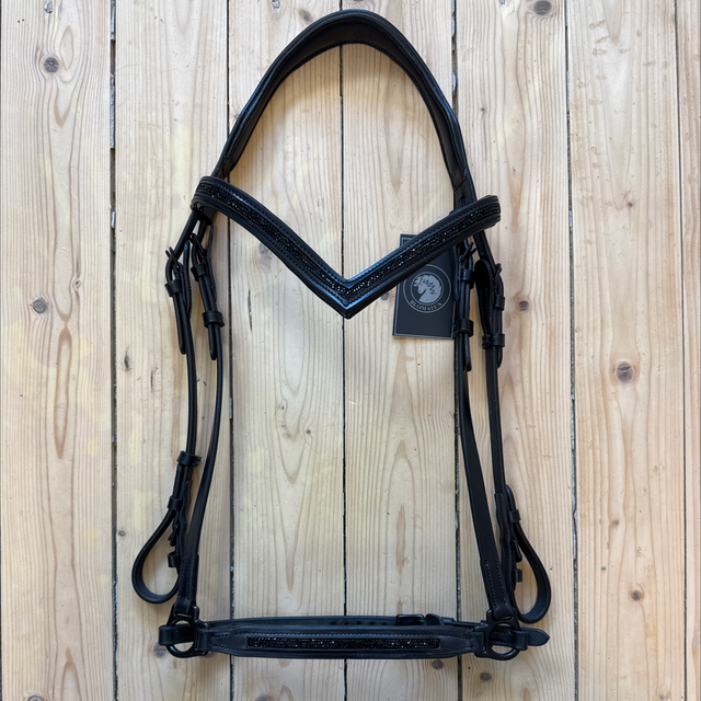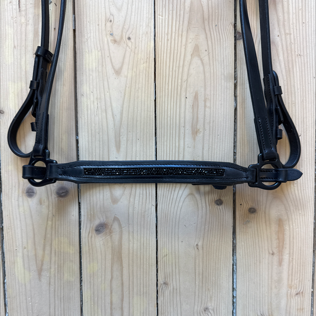 Die Trense Mánaskin ist ein elegantes einteiliges Hannoveranisches Reithalfter mit schwarzen Kristallen im zeitlosen Design.