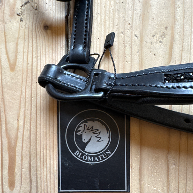 Die Trense Lysingur ist ein elegantes zweiteiliges Hannoveranisches Reithalfter mit schwarzen Kristallen im zeitlosen Design.