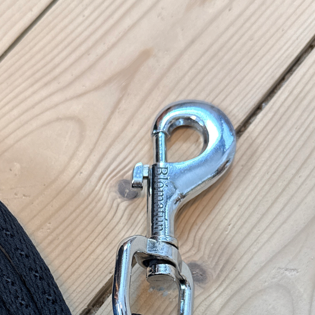 Der robuste silberfarbene Karabinerhaken sorgt für eine einfache Befestigung und überzeugt durch seine hohe Belastbarkeit. Eine integrierte Handschlaufe am Longenende bietet zusätzlichen Halt und Komfort bei der Arbeit vom Boden aus.